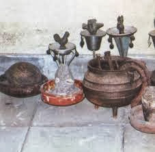 Eleggua Es el orisha que abre y cierra los caminos, esta deidad en sus diferentes caminos vive prácticamente en todos lados: la manigua, la basura, las cuatro esquinas, en la orilla del mar, del rio, etc. A Eleggua solo debe ponérsele como adimuses café amargo, dulces, caramelos, ñames hervidos, confituras, juguetes, siempre al tercer día se envuelve todo en un papel traza y se lleva a la manigua y se limpia con todo esto y lo dejara allí. Oggun y Ochosi Estos orishas viven juntos dentro de una cazuelita de metal, se representan a través de distintas herramientas de labranzas, que es el sincretismo de la vida y Ochosi a través de la flecha que es el cazador, la unión de ambos establece la fortaleza inquebrantable ante la vida. Tanto a Eleggua como Oggun y Ochosi, se le untan manteca de corojo a fin de estar preparados siempre para la guerra, que estos orishas deben librar. Osun Este orisha vive en el suelo, detrás de Oggun, y él representa la salud, por ende es un error sincretizarlo con la cabeza de nadie, ya que la cabeza pertenece a ori y ahí es donde se monta el ángel de la guarda, es decir que Osun no puede estar en alto porque así alejara su salud. Osun lo componen 5 partes importantes, el gallito es la vitalidad y fuerza de salud. Ante la vida, el plato que lo sostiene es la tierra, la copa son los 4 puntos cardinales hacia donde nos dirigimos en la vida, la varilla son las piernas nuestras que nos sostienen y la base es el mundo, por eso vive en el suelo y no en el aire, a él se unta manteca de cacao, si en algún momento el se cae solo (sin que nadie lo tumbe), Ud. deberá acudir inmediatamente a casa de su padrino con el Osun y una paloma blanca, ya que esta avisando de un problema de salud grave. Tanto a Eleggua, como a Oggun, Ochosi y Osun, se les sopla aguardiente, o ron, se les vierte encima miel, se les sopla humo de tabaco, y se les rosea por encima maíz tostado, jutía ahumada y pescado ahumado, todo esto para el desenvolvimiento, con estos orishas no hay que arrodillarse para atenderlos una vez por semana, solo se enciende una vela delante de estos cuatro (Eleggua, Oggun, Ochosi y Osun). Nota: Previa coordinación con su padrino deberá una vez al año, hacerles sacrificios, o sea, darle de comer a estos un pollón cantón o gallo y una paloma haciéndose Ebbo